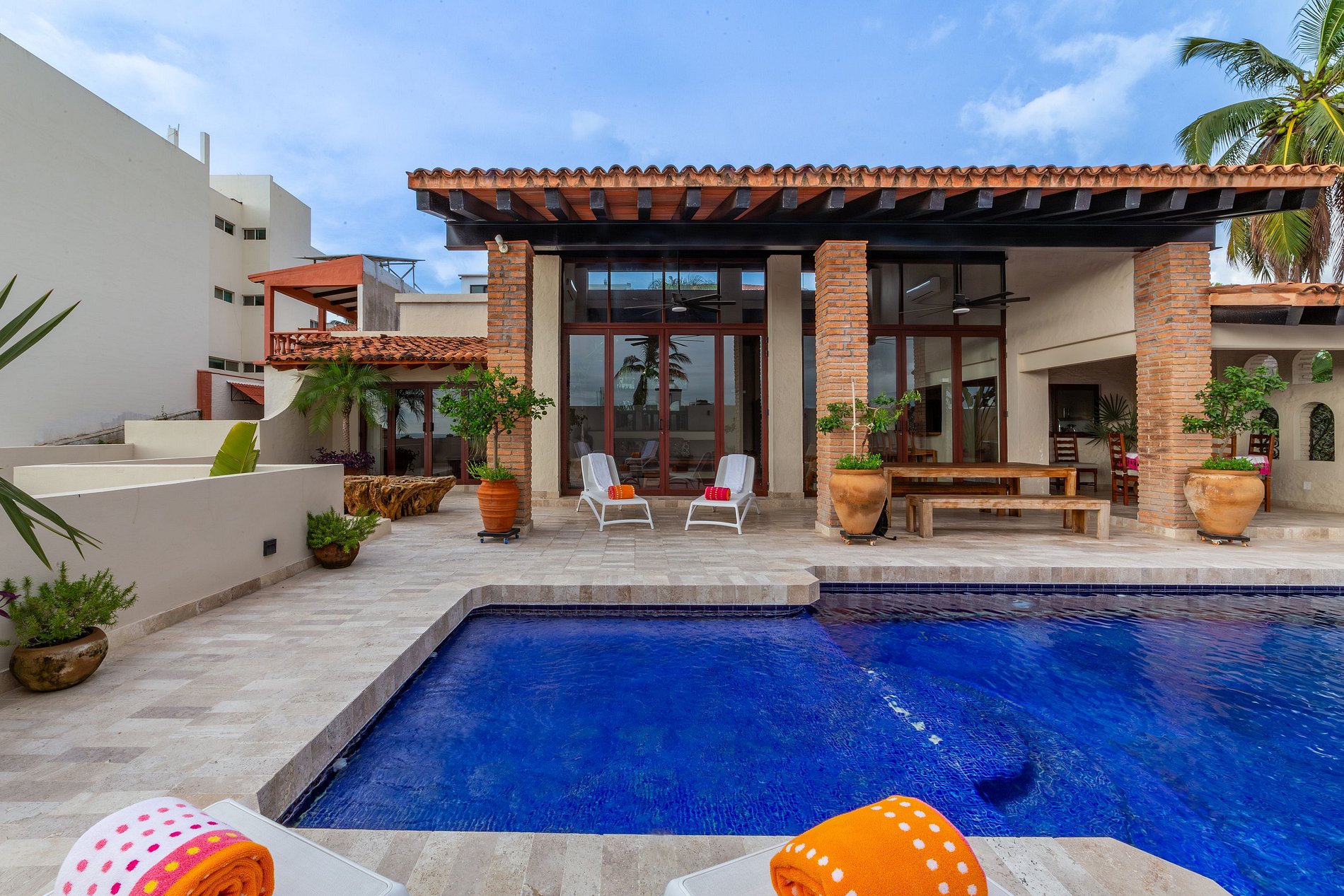 La terraza es uno de los espacios más especiales de la casa: tiene una gran mesa de madera para comidas al aire libre, asador, camastros para tomar el sol y una acogedora sala lounge exterior. La alberca cuenta con área de chapoteadero/asoleadero y un tamaño ideal para nadar o simplemente disfrutar de una tarde tranquila.