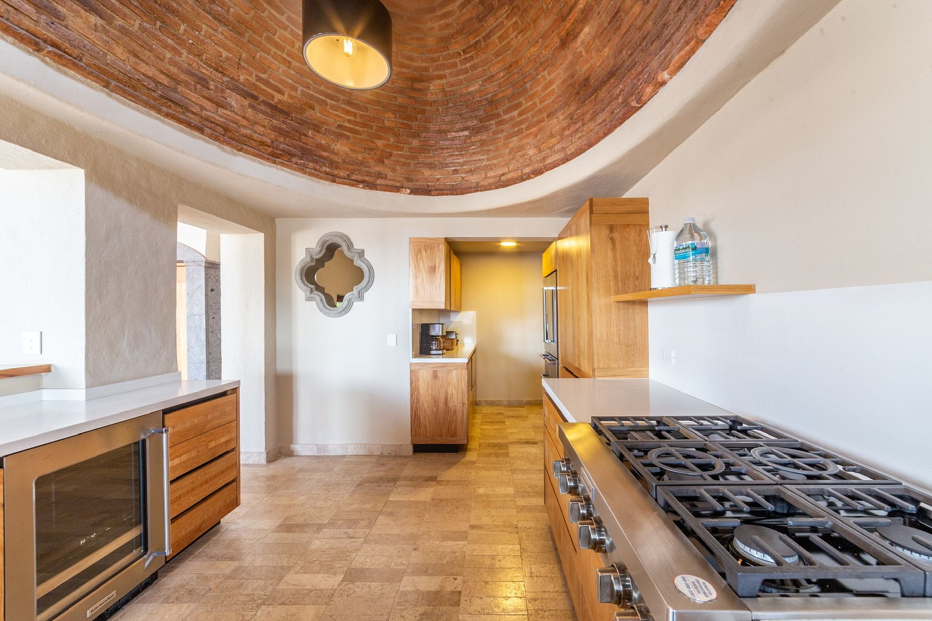 La cocina de la casa, bajo una impresionante cúpula, está equipada con electrodomésticos de lujo. La sala de doble altura brinda frescura y conecta directamente con la alberca principal, que ofrece espacio suficiente para que todos los huéspedes de la propiedad la disfruten con comodidad. También cuenta con asador y mesas exteriores para comidas al aire libre.