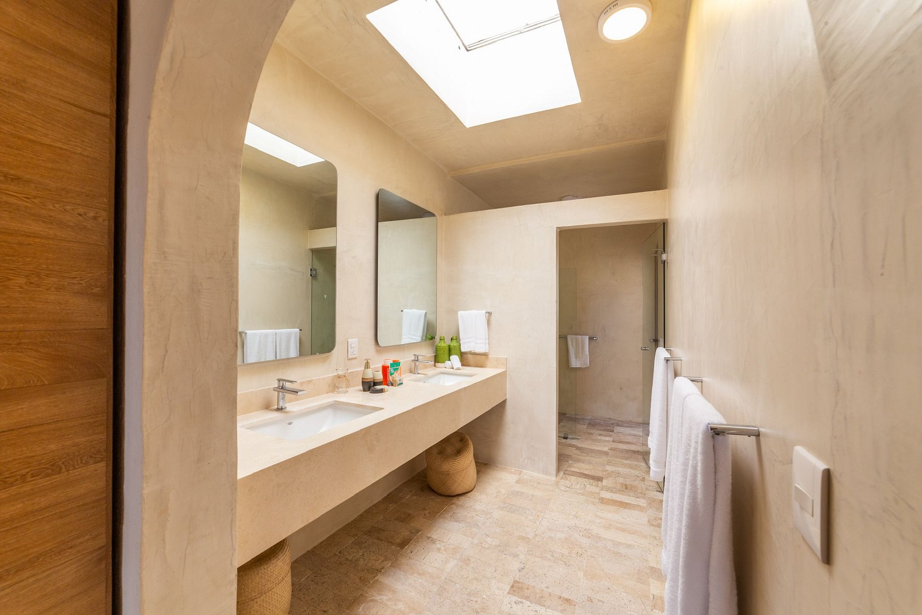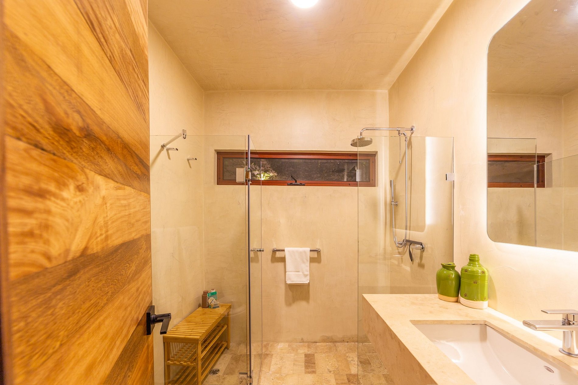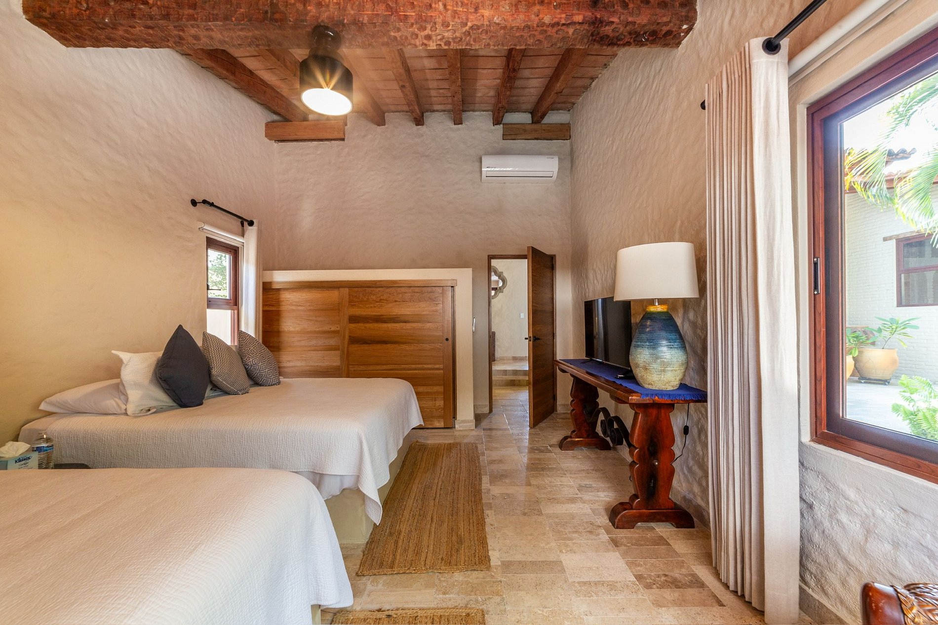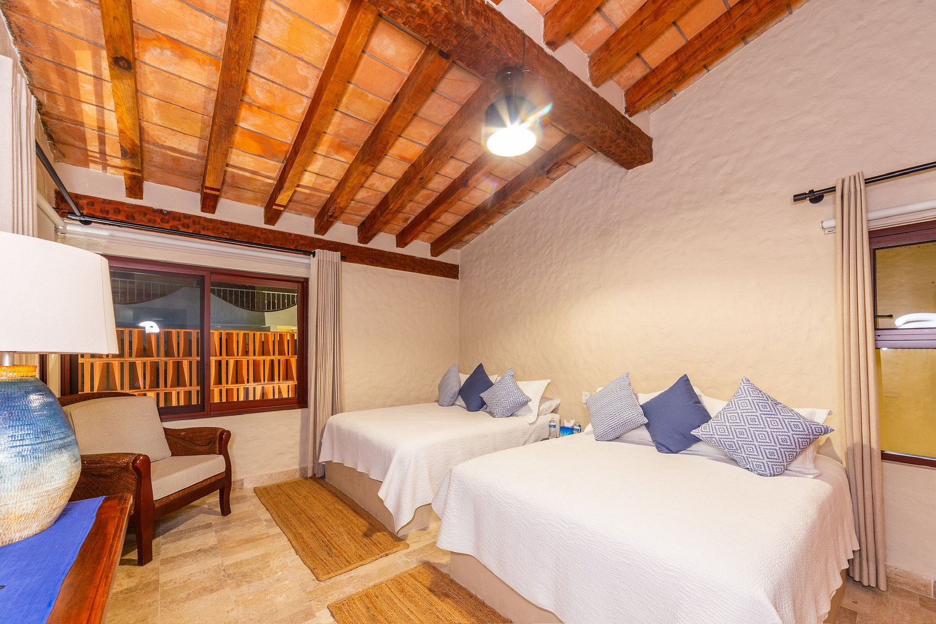 La casa principal tiene dos recámaras. La recámara principal incluye cama king, sala de televisión, clóset, aire acondicionado, baño completo con doble lavabo y regaderas interior y exterior, además de una sala lounge con acceso directo a la alberca. La segunda recámara tiene dos camas queen, aire acondicionado, clóset y un baño completo justo a la salida.