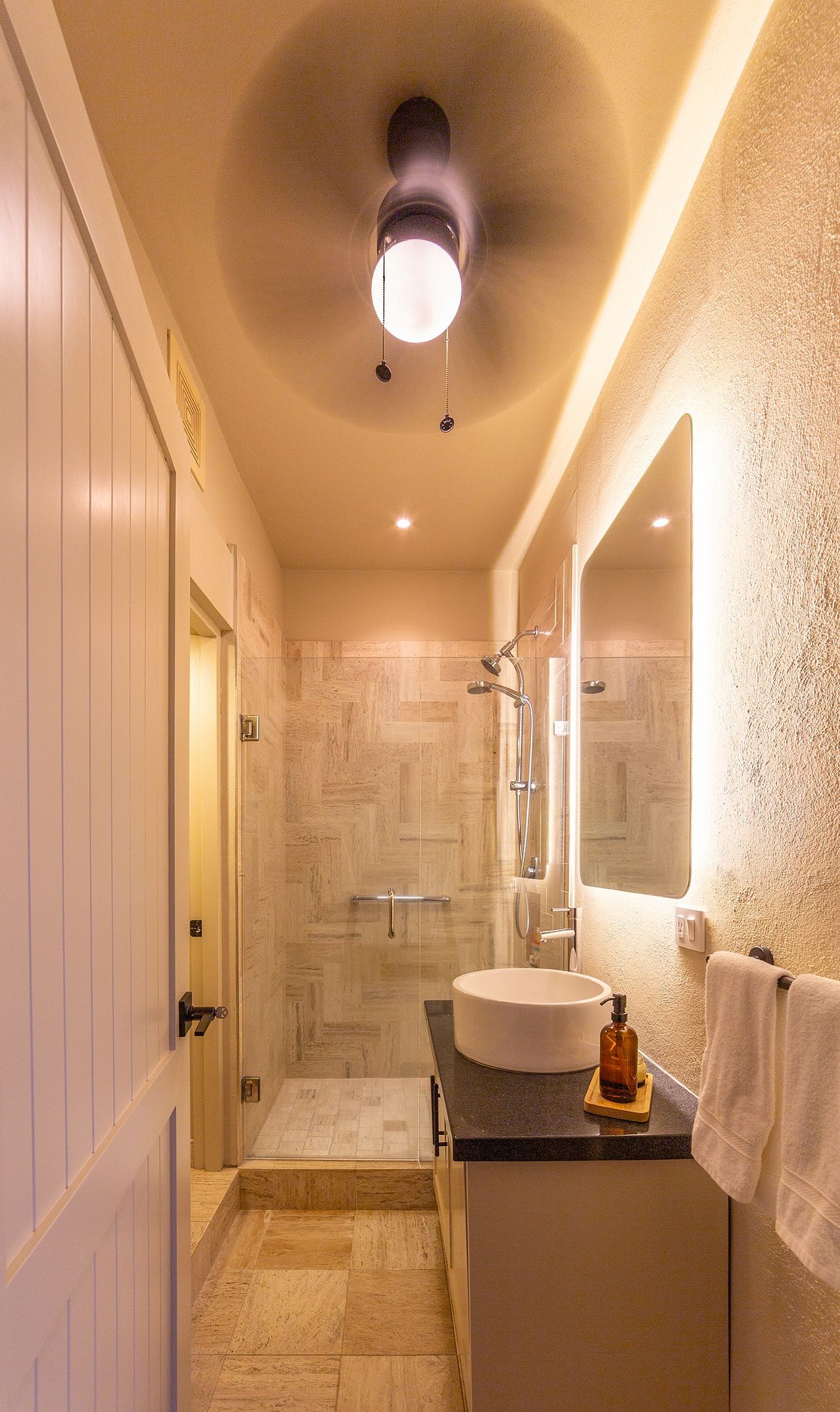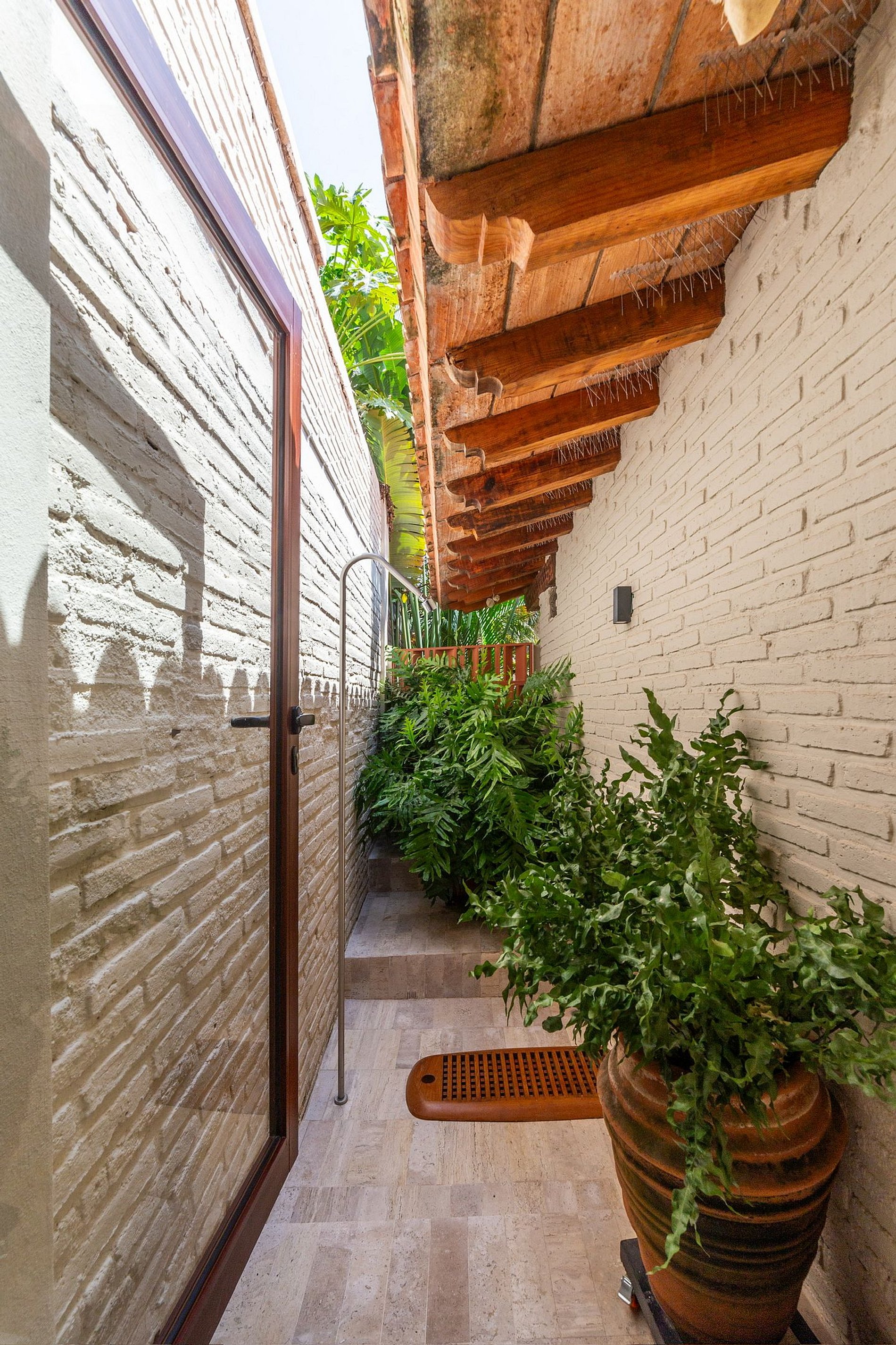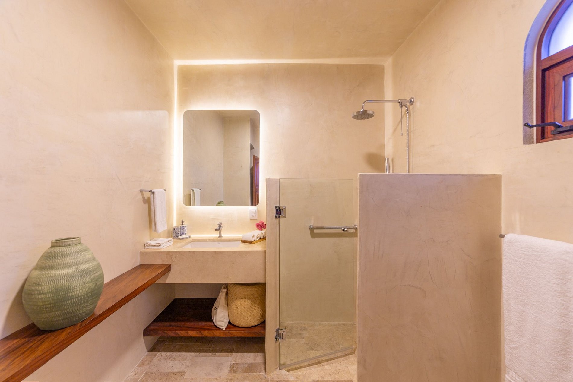 El cuarto departamento, situado un nivel abajo de la casa, es un acogedor refugio con toques mexicanos. Tiene cama king, refrigerador, cocina, regadera interior y exterior, aire acondicionado, baño con doble lavabo, sala de televisión y su propia alberca privada, ideal para una tarde de descanso.