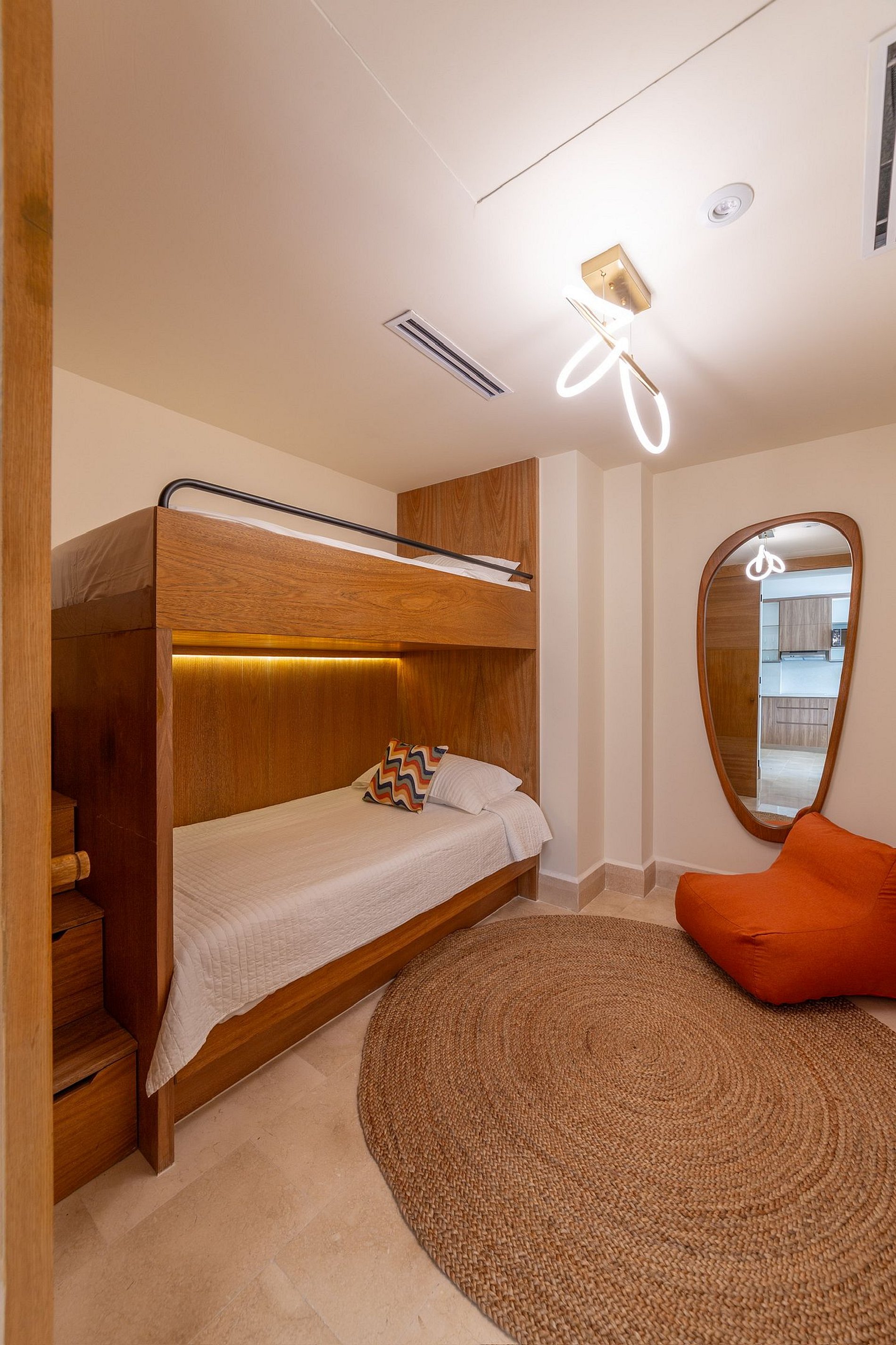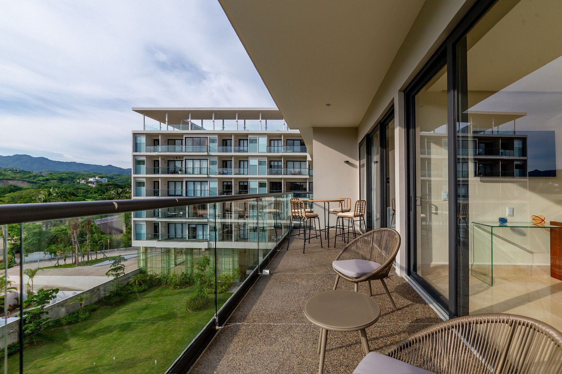 El cuarto principal tiene cama king size, aire acondicionado, smart TV, baño completo y una hermosa vista a la montaña. La segunda habitación cuenta con litera, ideal para niños, aunque un adulto puede dormir cómodamente; tiene un baño completo justo afuera. La cocina está equipada con estufa eléctrica y utensilios básicos, y el comedor para seis personas es perfecto para compartir en familia antes de salir a la playa. La sala tiene un sofá cama muy cómodo, ideal para ver películas en familia. La terraza es un espacio para disfrutar en cualquier momento del día: por la mañana, un café con vista a la montaña; por la tarde, una copa de vino en las periqueras mientras se asoma la vista lateral al mar.Si viajas con más personas, puedes reservar el departamento contiguo, que cuenta con una cama king size y una litera.