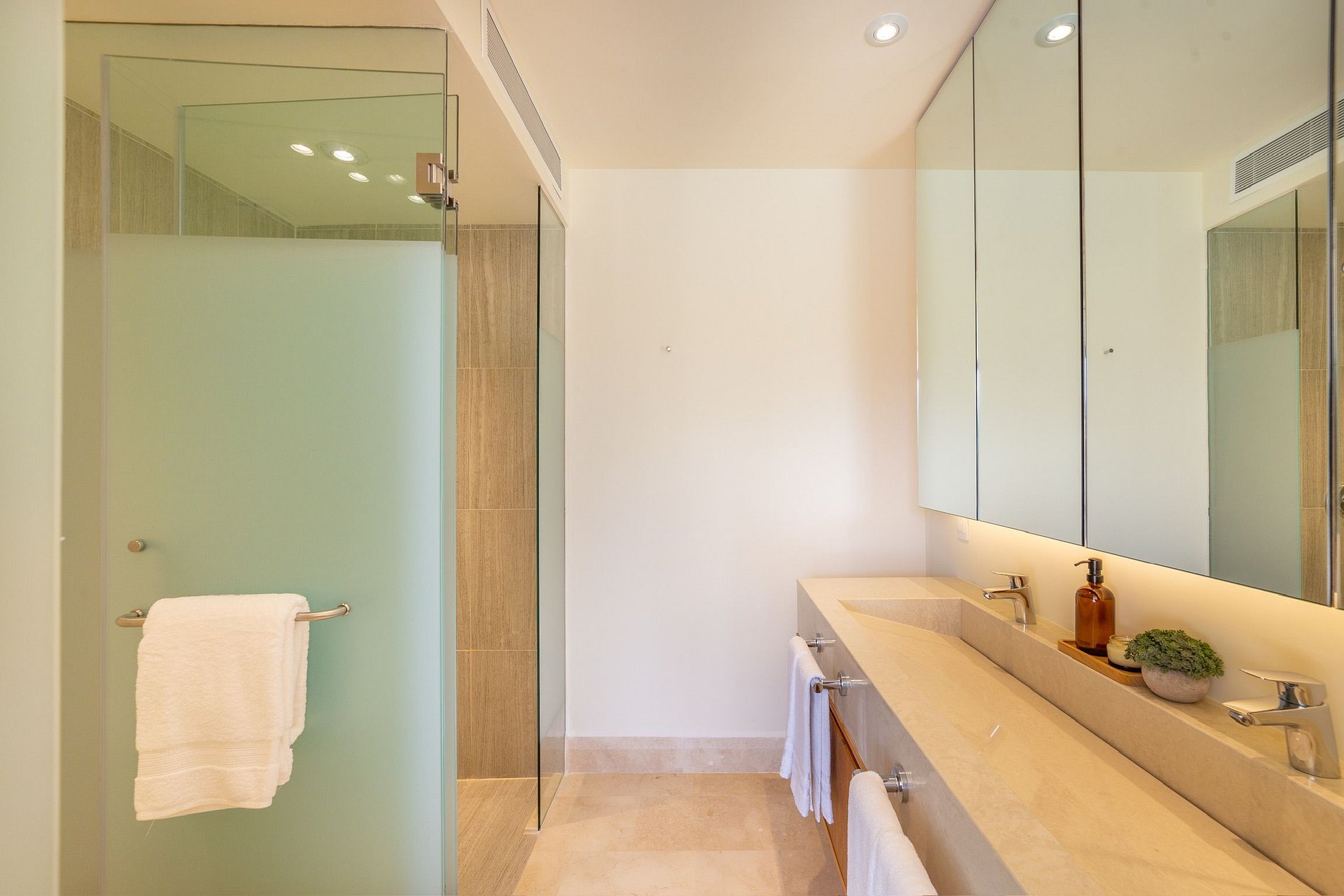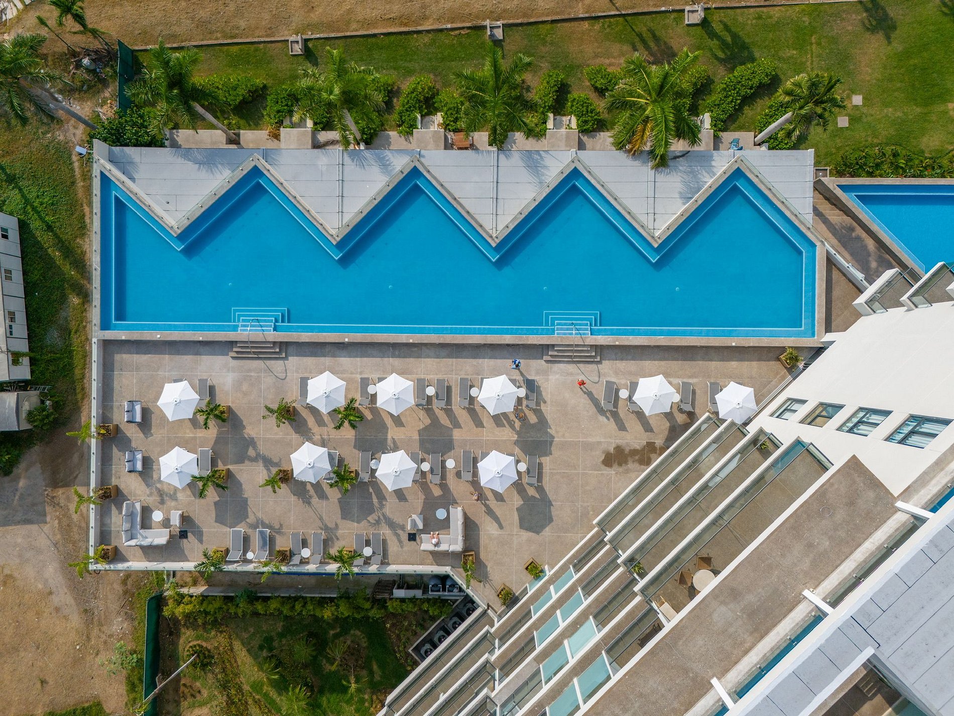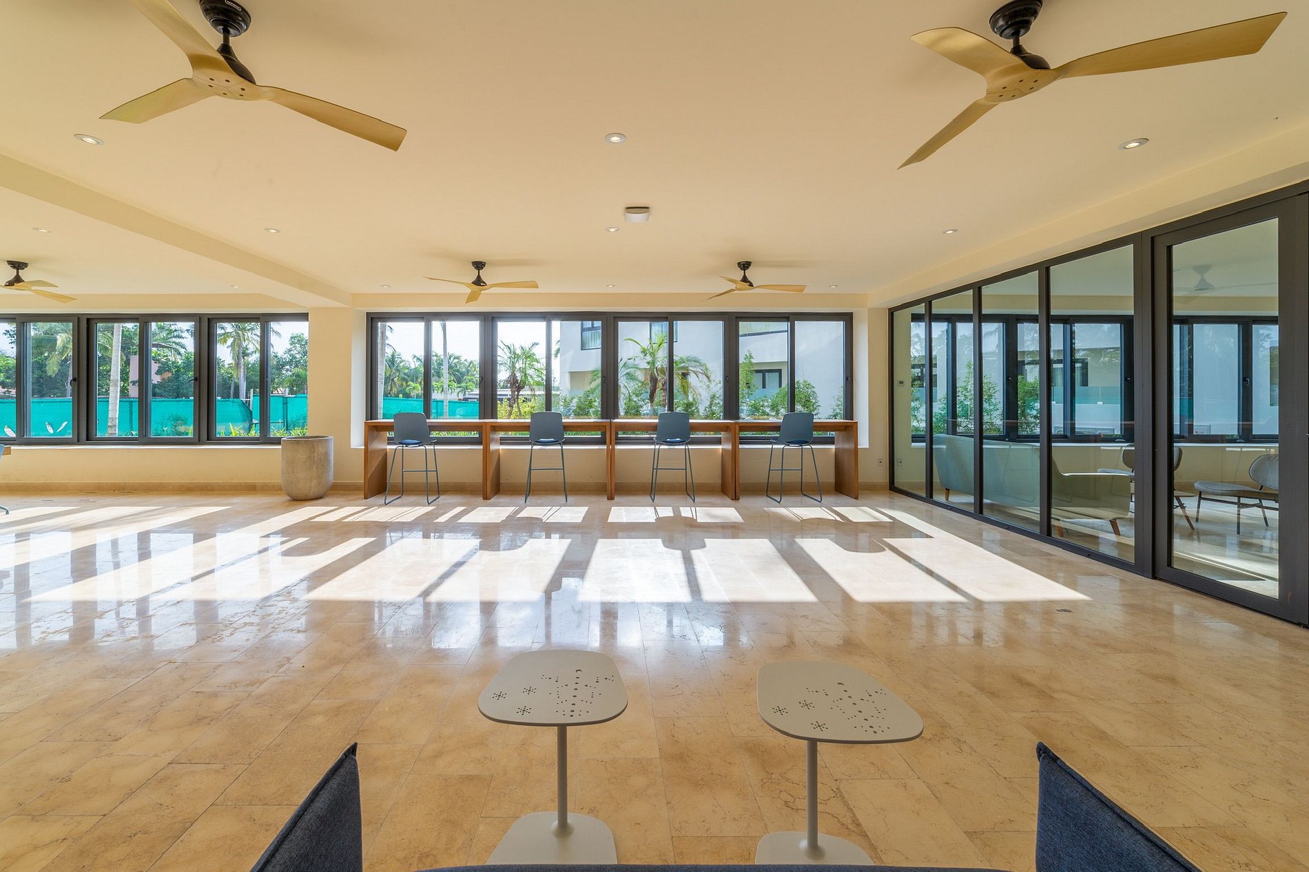 El edificio cuenta con dos albercas: una en planta baja con acceso directo al jardín y a la playa, y otra en el mezzanine con una hermosa vista al mar y a los veleros de la bahía. Para familias, hay un área de juegos infantiles frente al área de coworking, lo que permite trabajar mientras los niños se divierten. También dispone de un gimnasio completo disponible todos los días. La playa frente al edificio tiene algunas piedras, perfectas para ver peces pequeños y cangrejos. Para nadar, basta con caminar 50 metros a la derecha hasta la zona arenosa o hacia la izquierda para llegar a una playa más amplia.