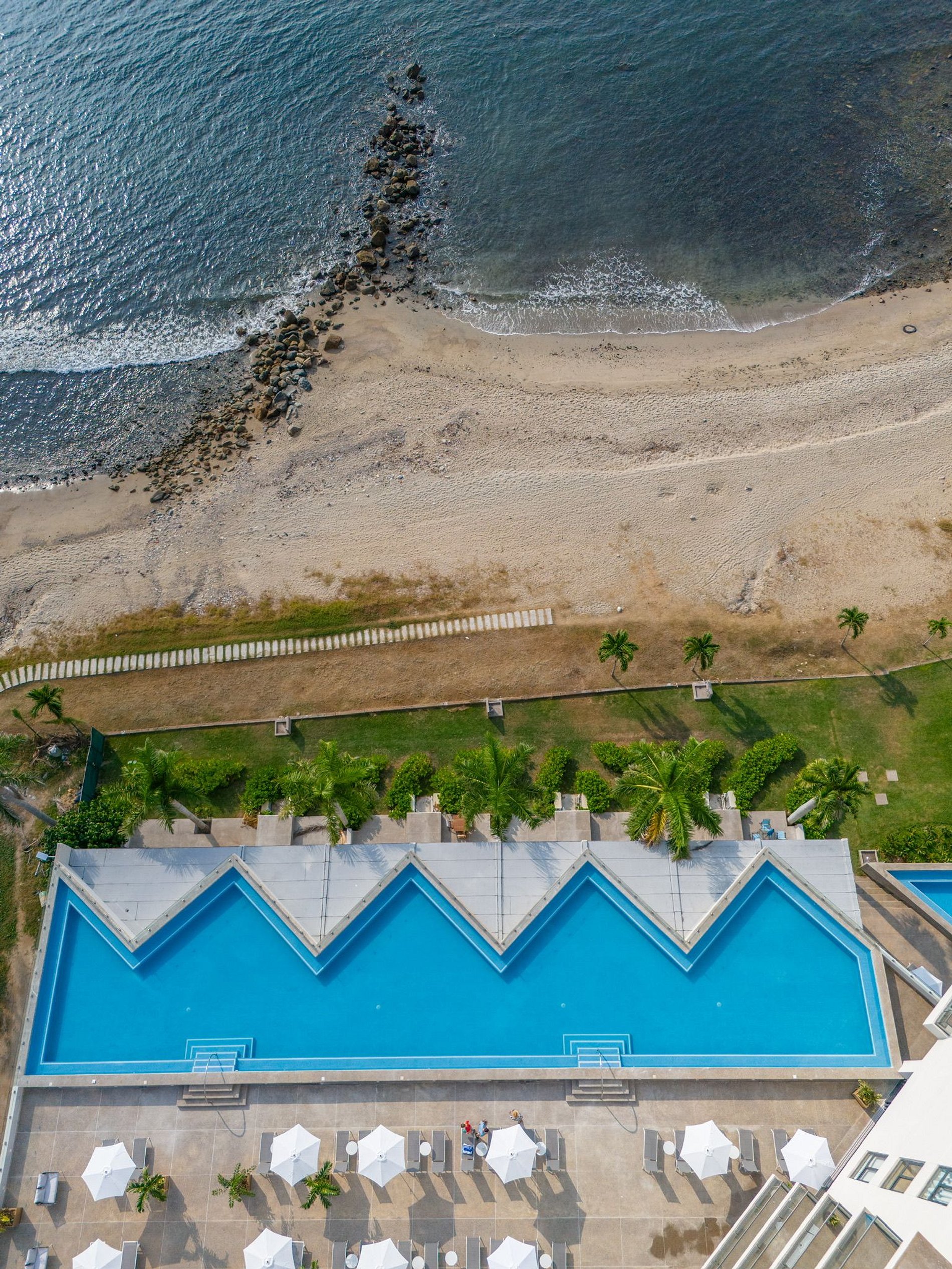 El edificio cuenta con dos albercas: una en planta baja con acceso directo al jardín y a la playa, y otra en el mezzanine con una hermosa vista al mar y a los veleros de la bahía. Para familias, hay un área de juegos infantiles frente al área de coworking, lo que permite trabajar mientras los niños se divierten. También dispone de un gimnasio completo disponible todos los días. La playa frente al edificio tiene algunas piedras, perfectas para ver peces pequeños y cangrejos. Para nadar, basta con caminar 50 metros a la derecha hasta la zona arenosa o hacia la izquierda para llegar a una playa más amplia.